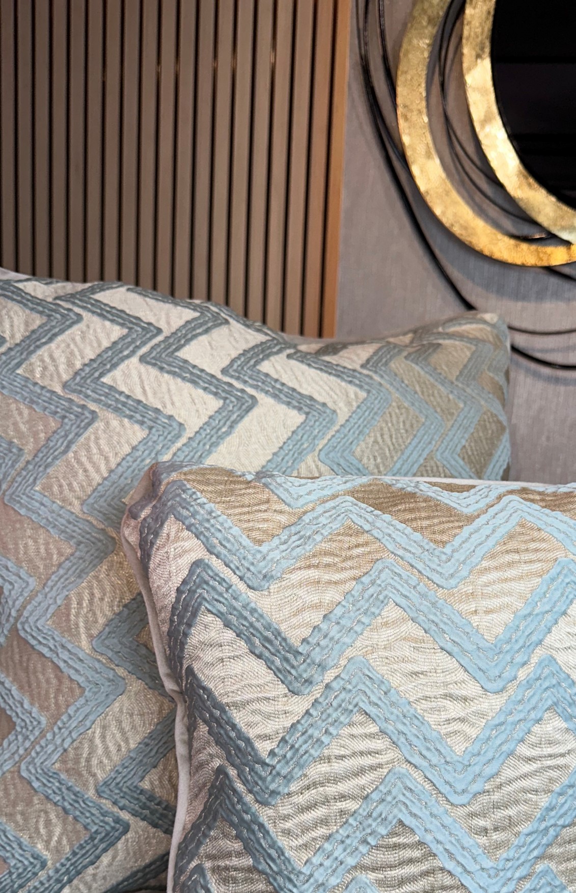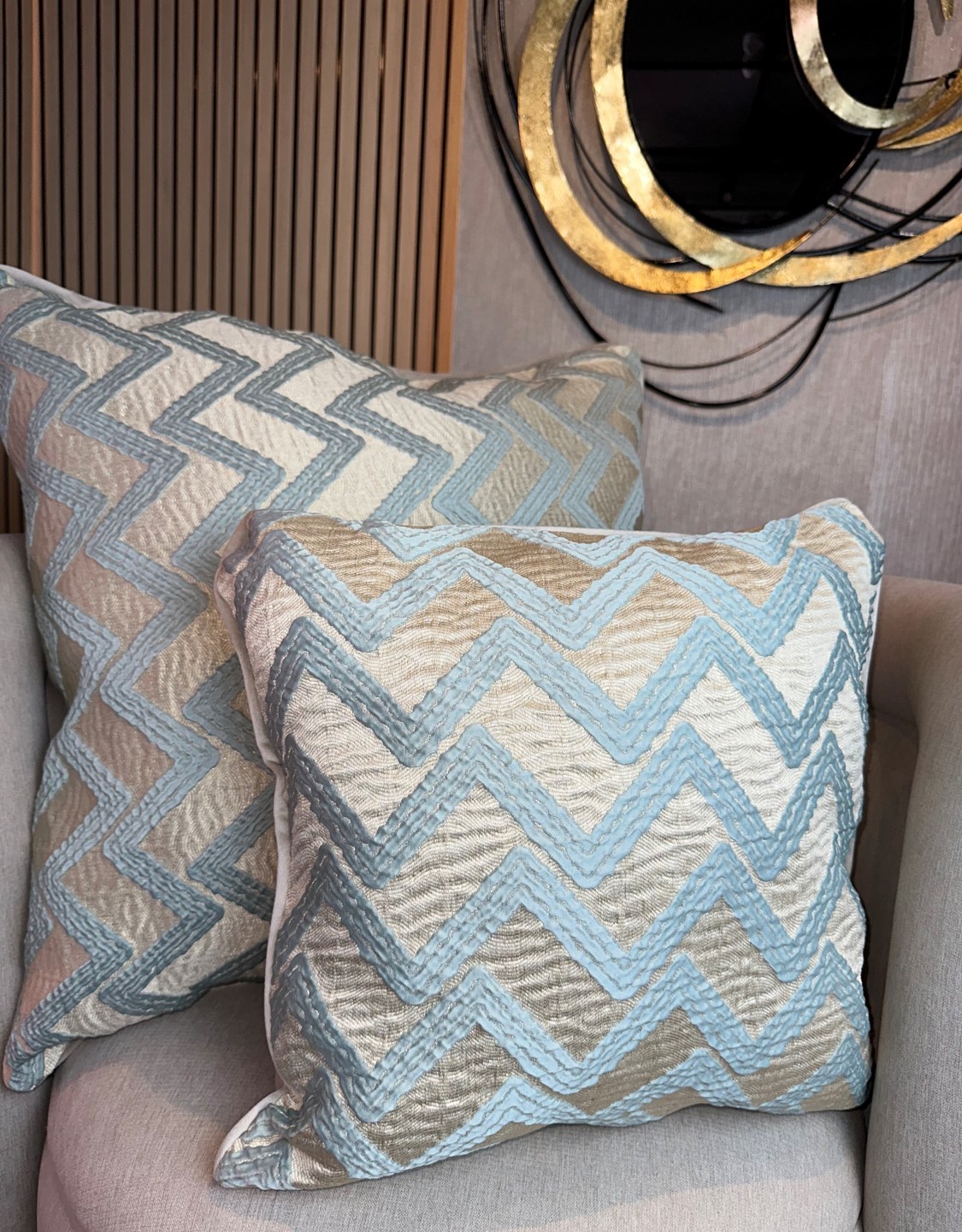 Descripción: Cojín decorativo importado de alta gama con acabados exclusivos de finos textiles