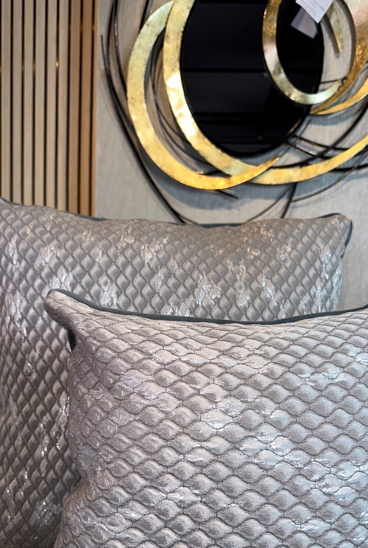Descripción: Cojín decorativo importado de alta gama con acabados exclusivos de finos textiles