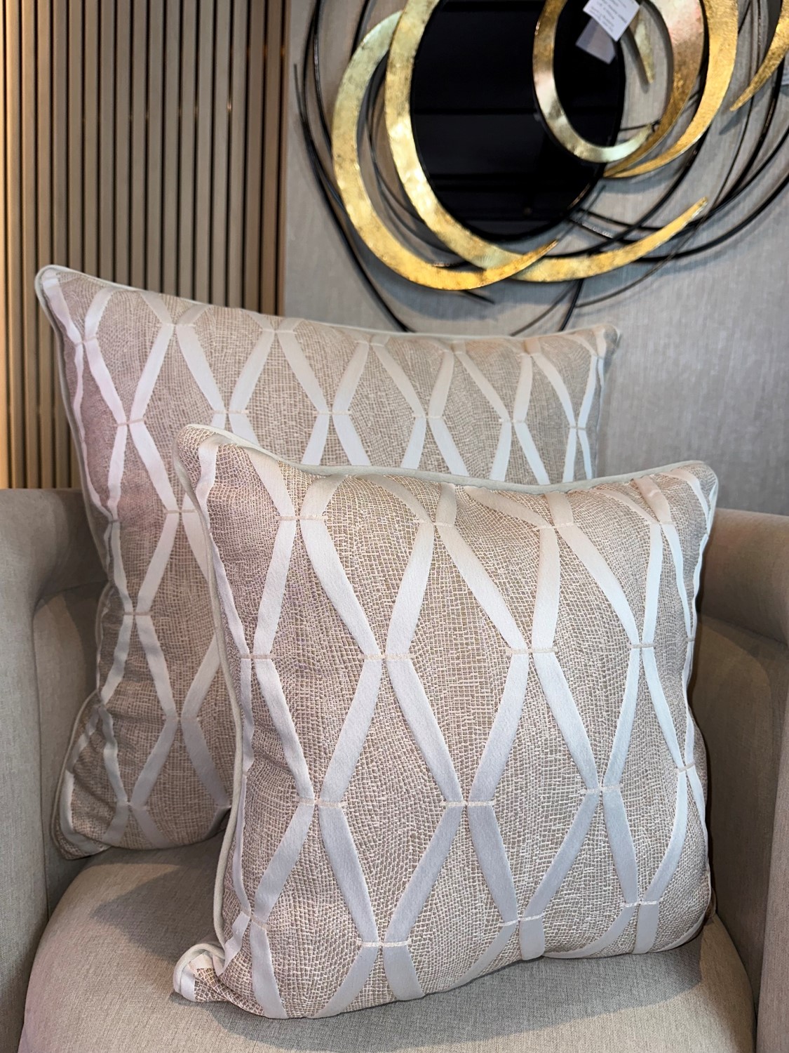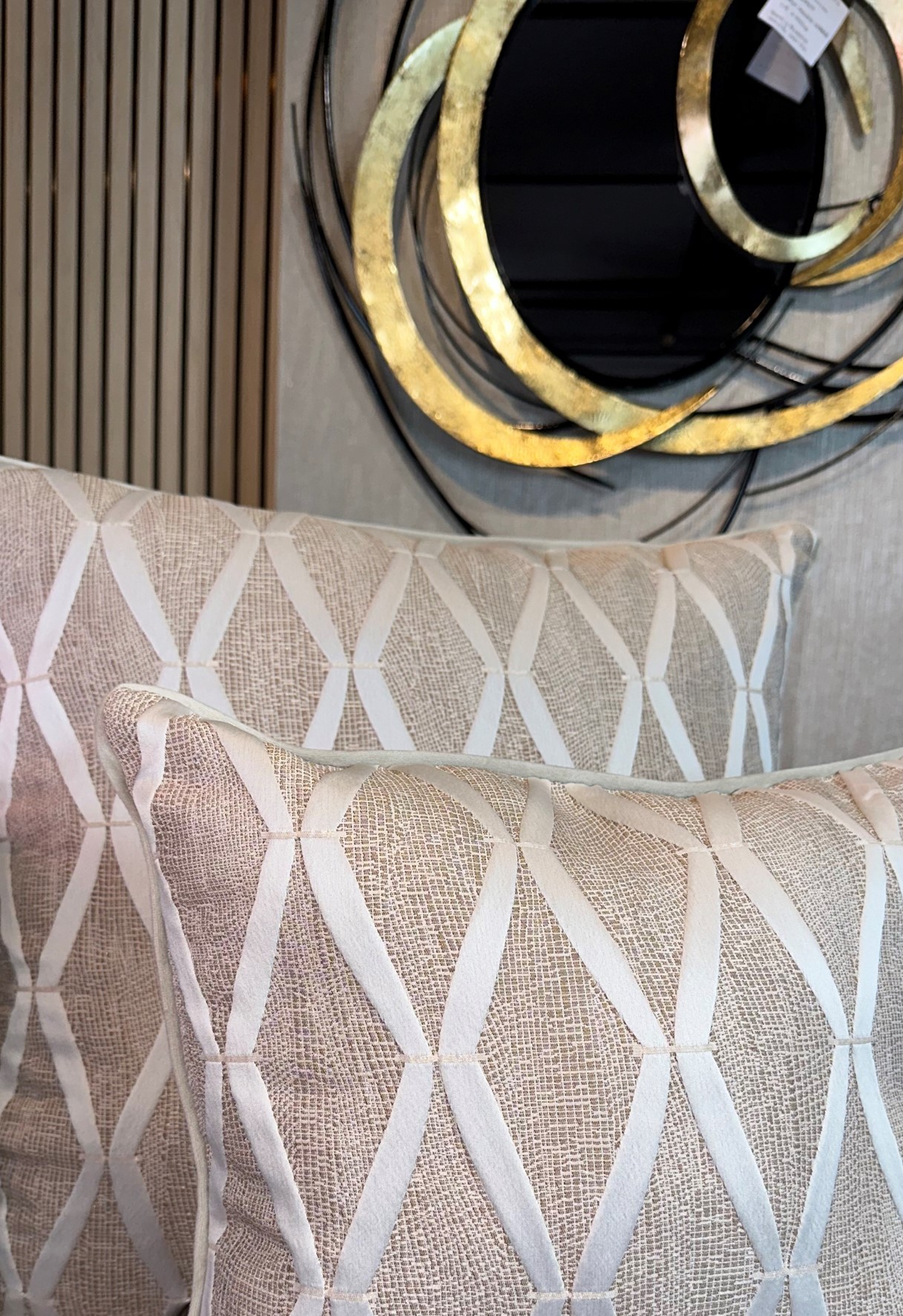 Descripción: Cojín decorativo importado de alta gama con acabados exclusivos de finos textiles