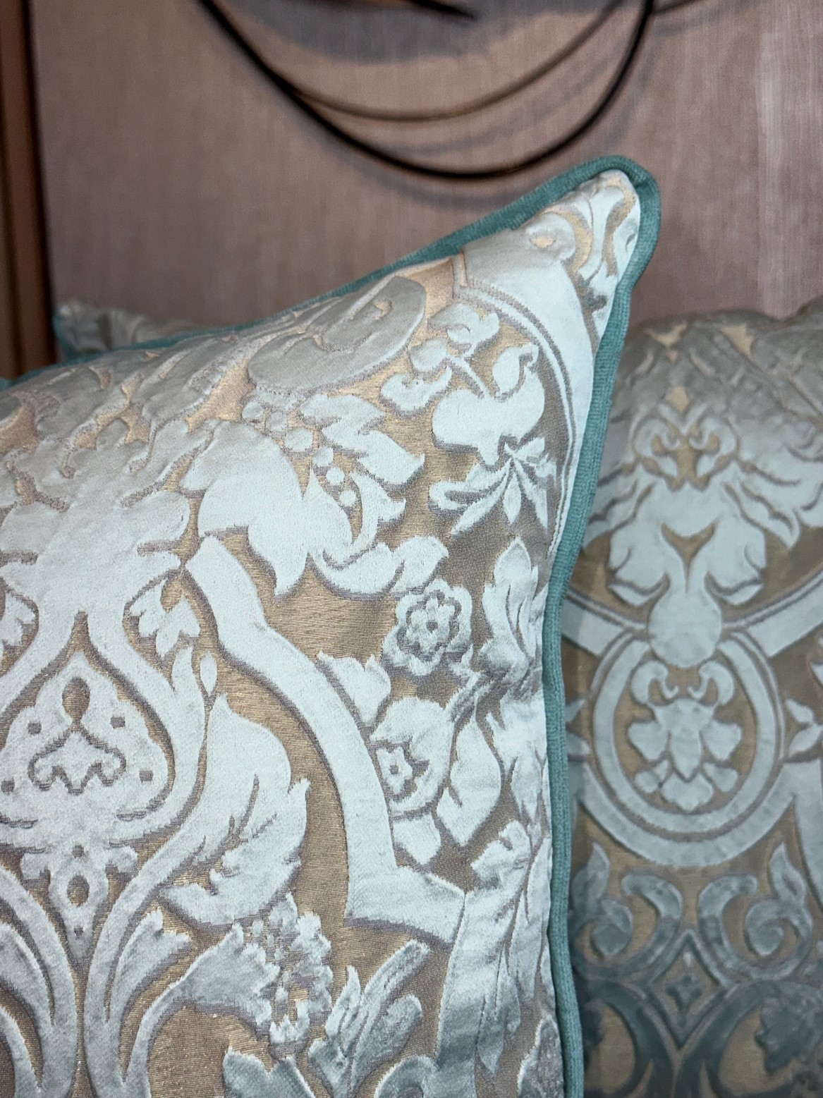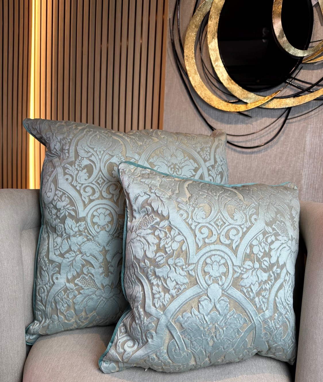 Descripción: Cojín decorativo importado de alta gama con acabados exclusivos de finos textiles