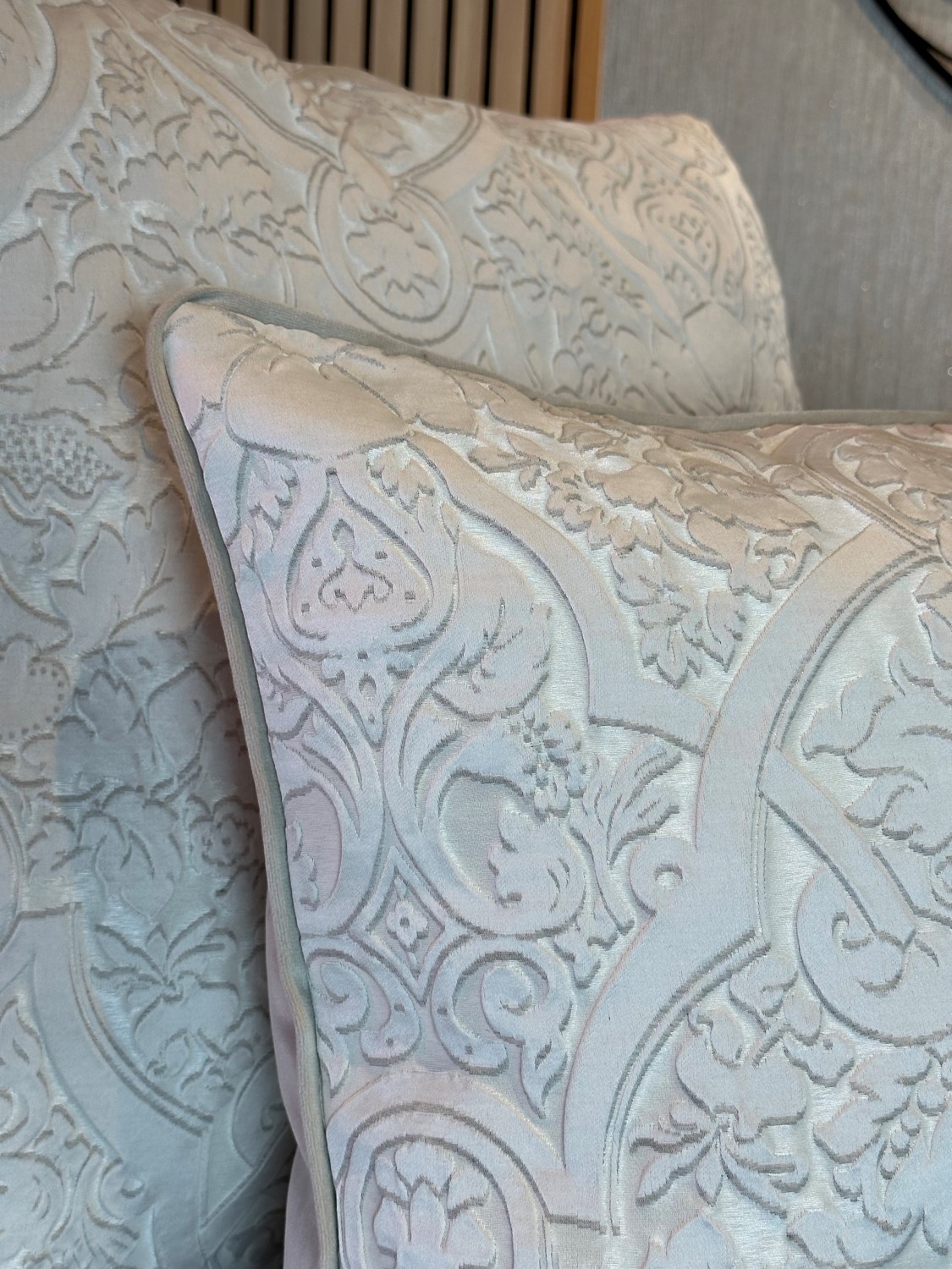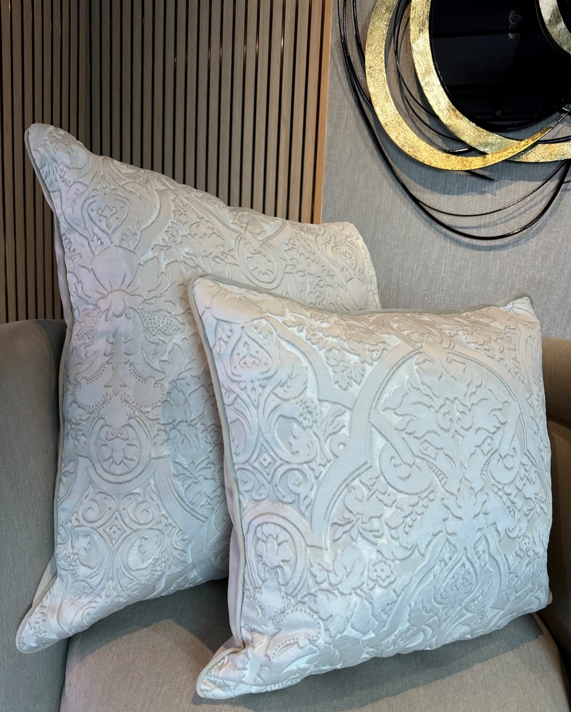 Descripción: Cojín decorativo importado de alta gama con acabados exclusivos de finos textiles