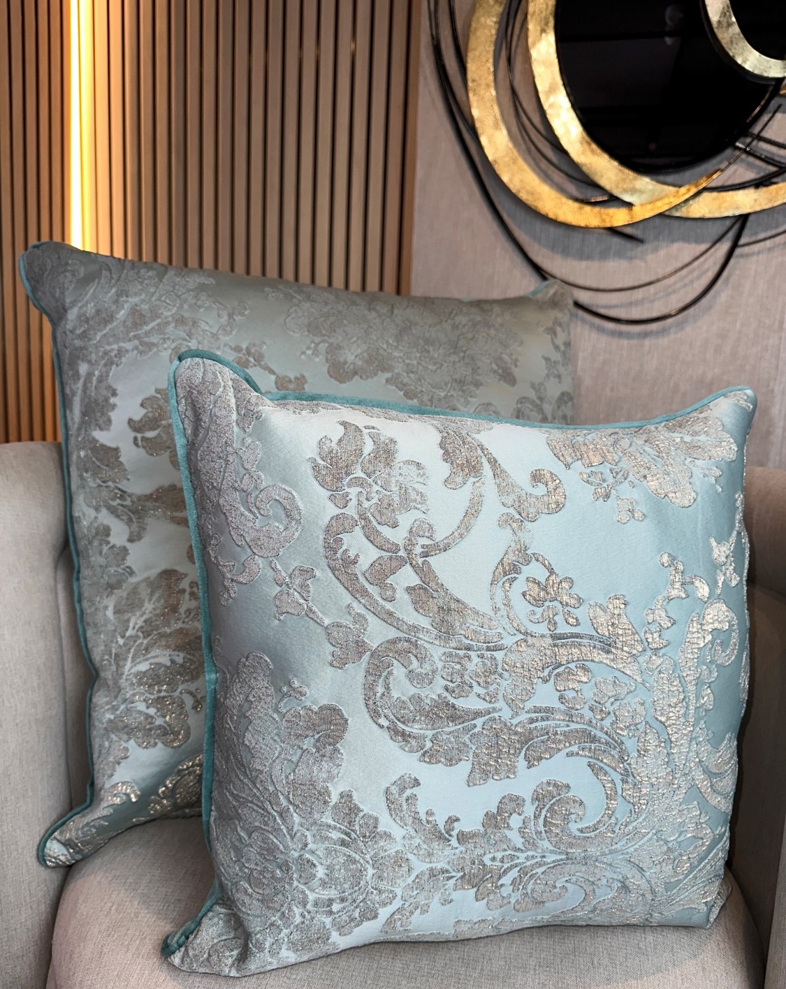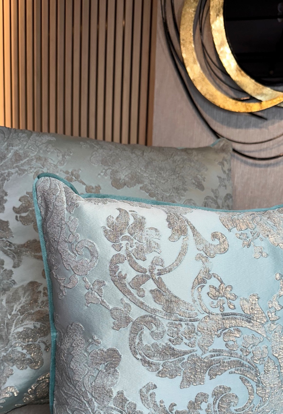 Descripción: Cojín decorativo importado de alta gama con acabados exclusivos de finos textiles