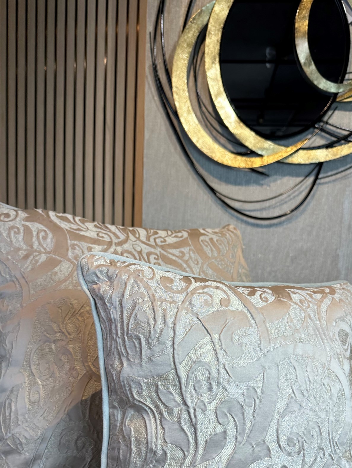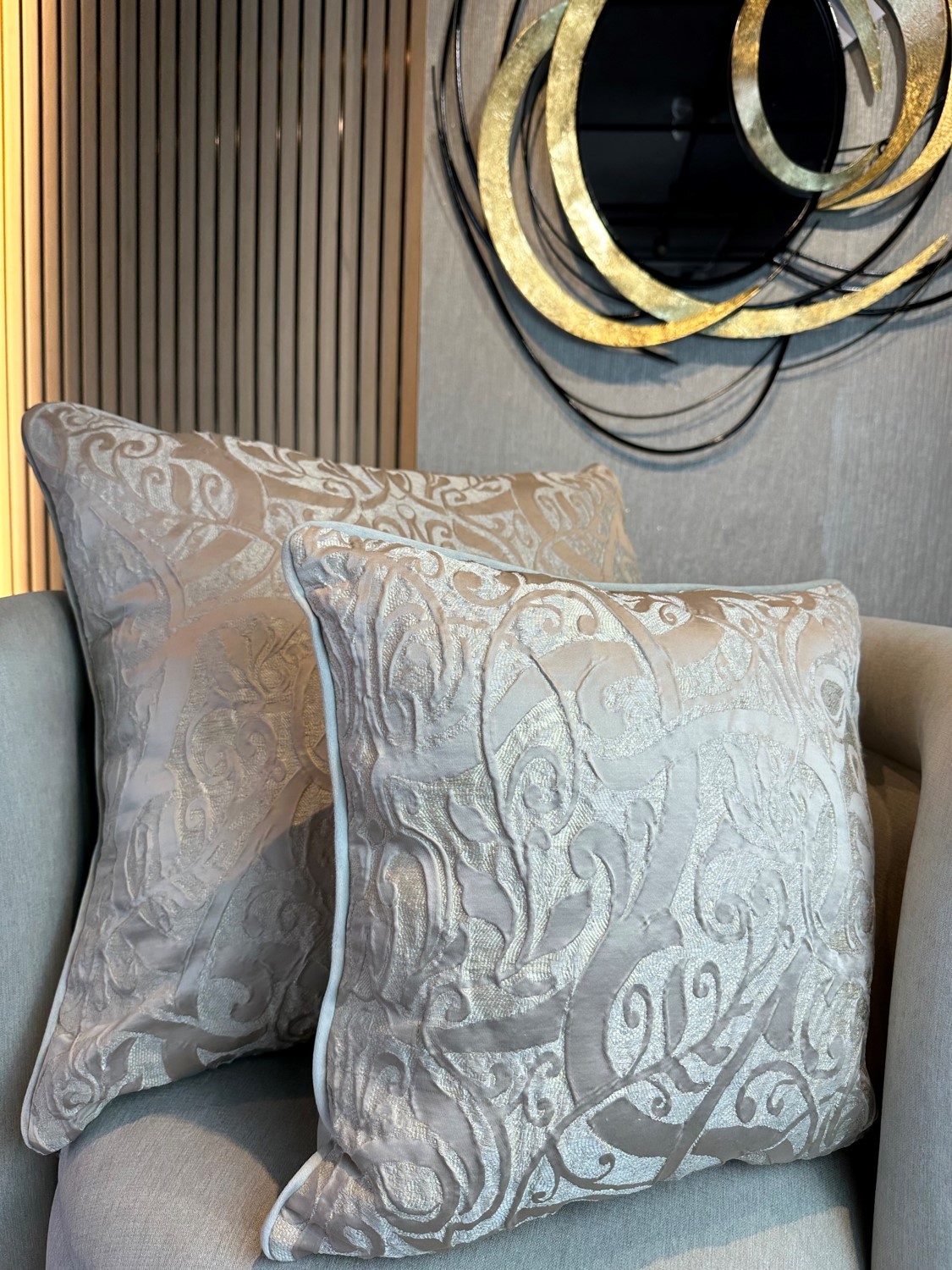 Descripción: Cojín decorativo importado de alta gama con acabados exclusivos de finos textiles