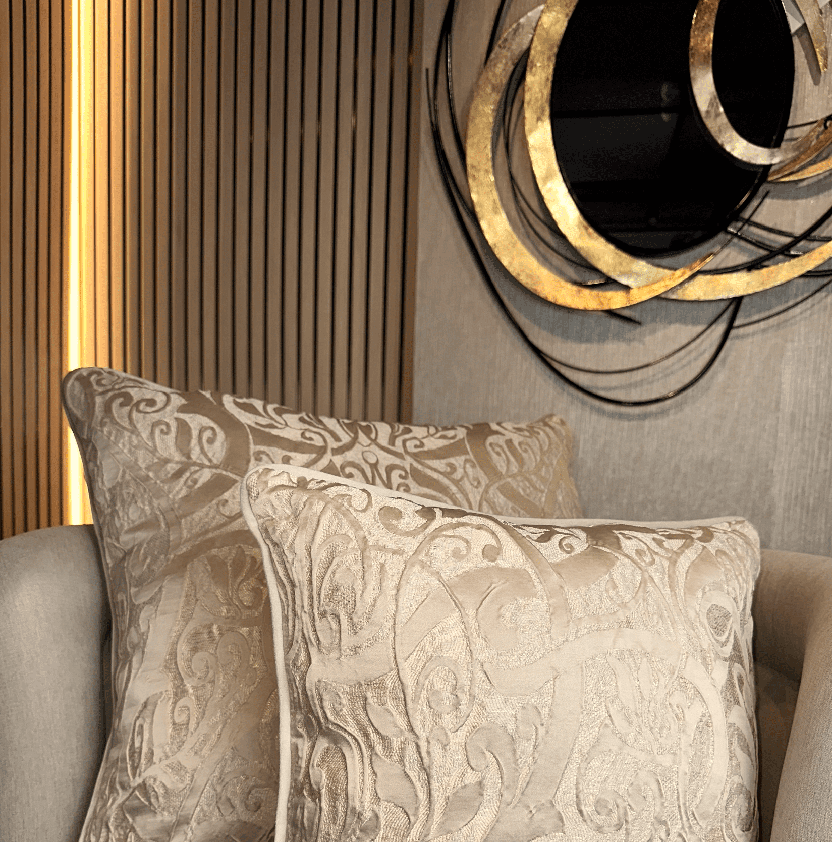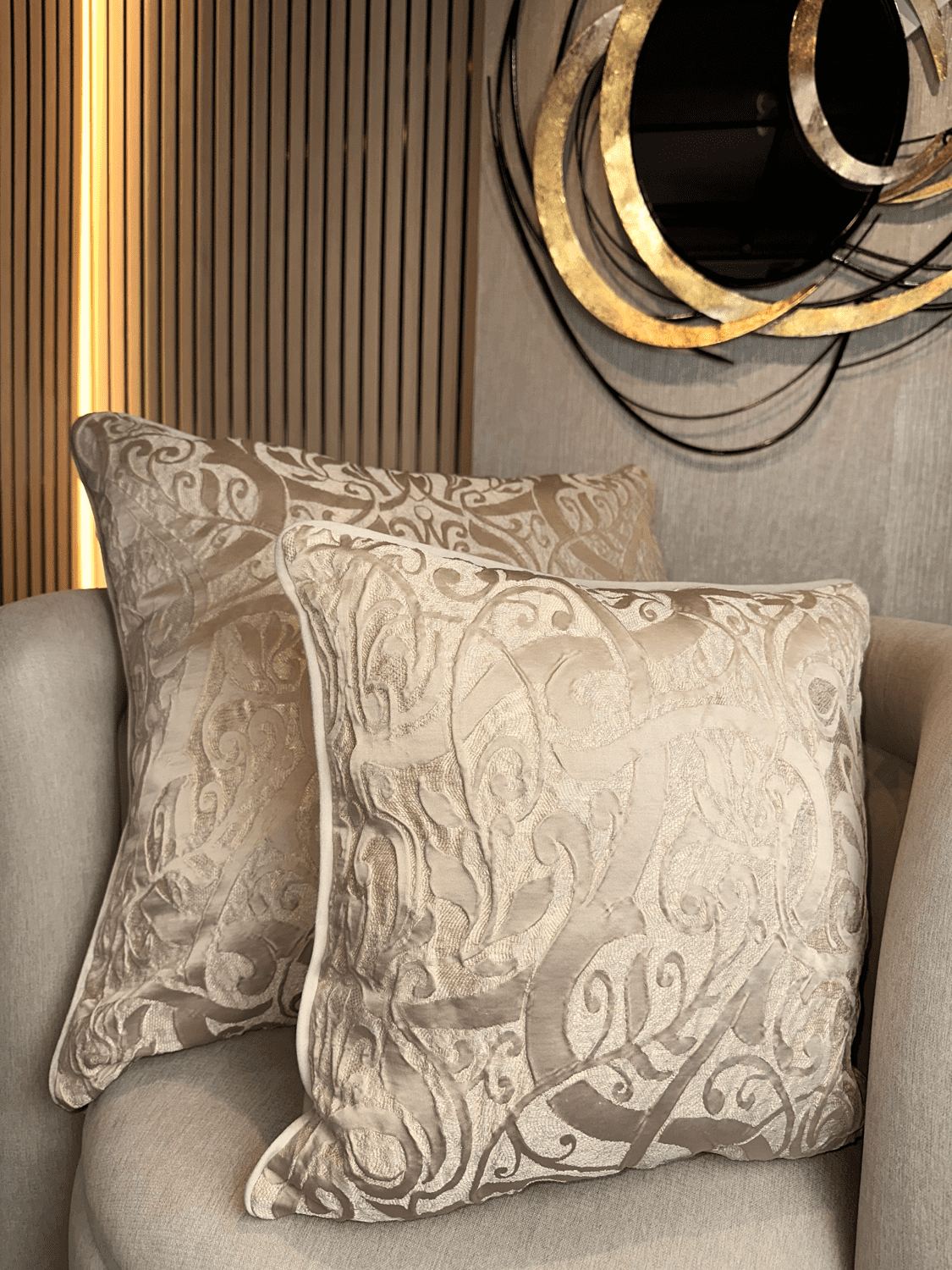 Descripción: Cojín decorativo importado de alta gama con acabados exclusivos de finos textiles