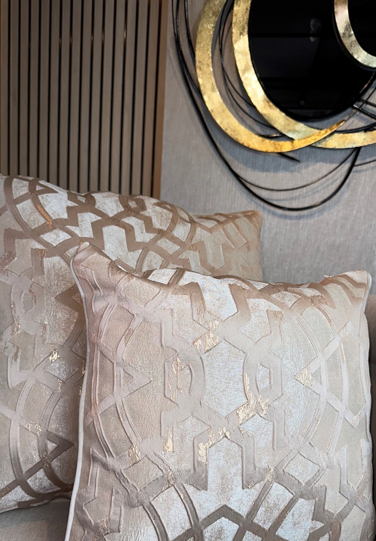 Descripción: Cojín decorativo importado de alta gama con acabados exclusivos de finos textiles